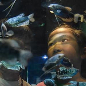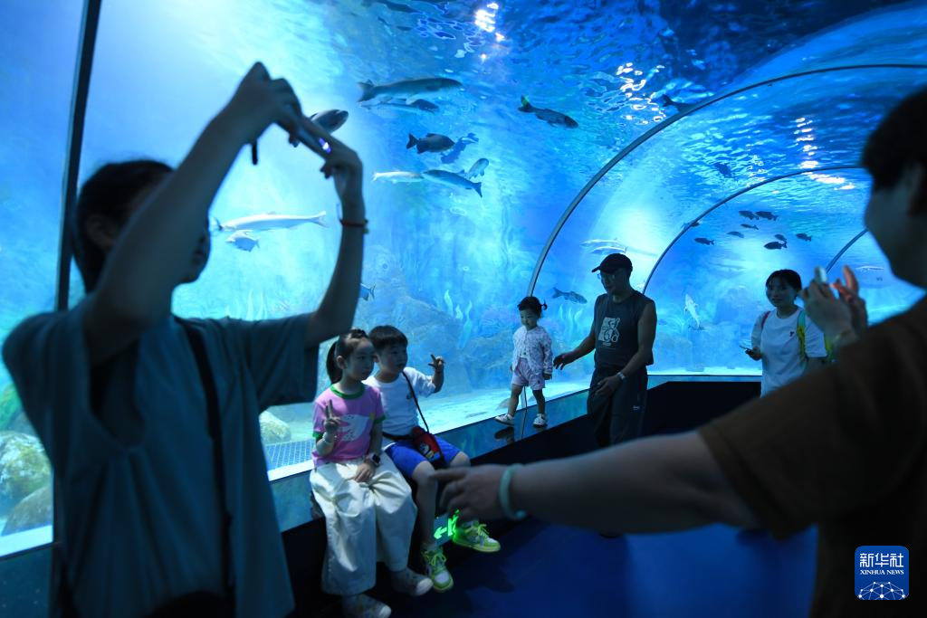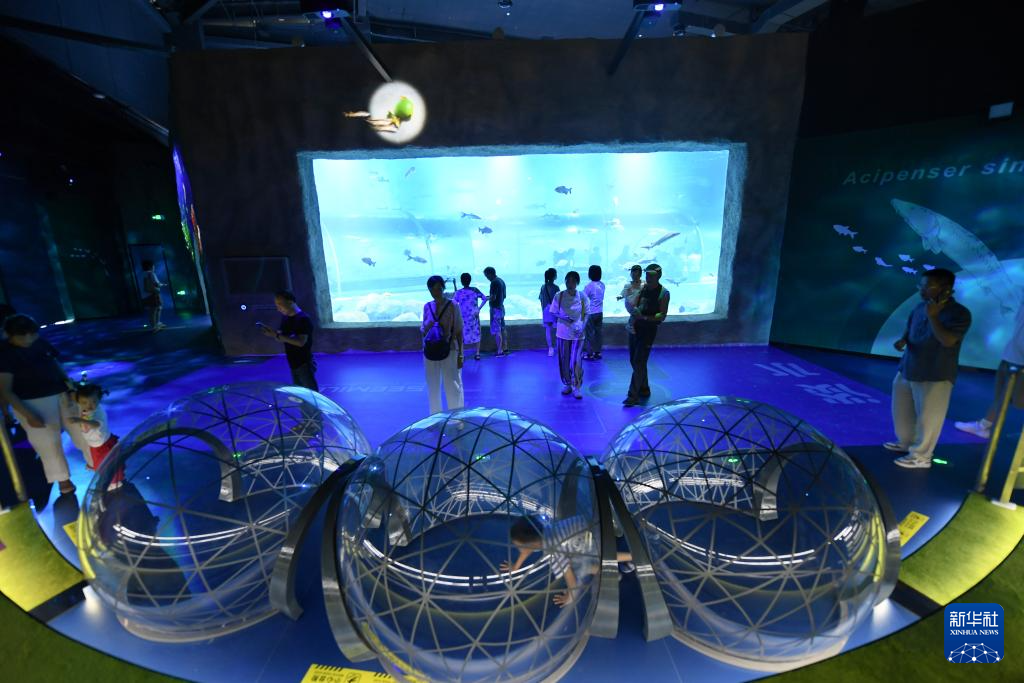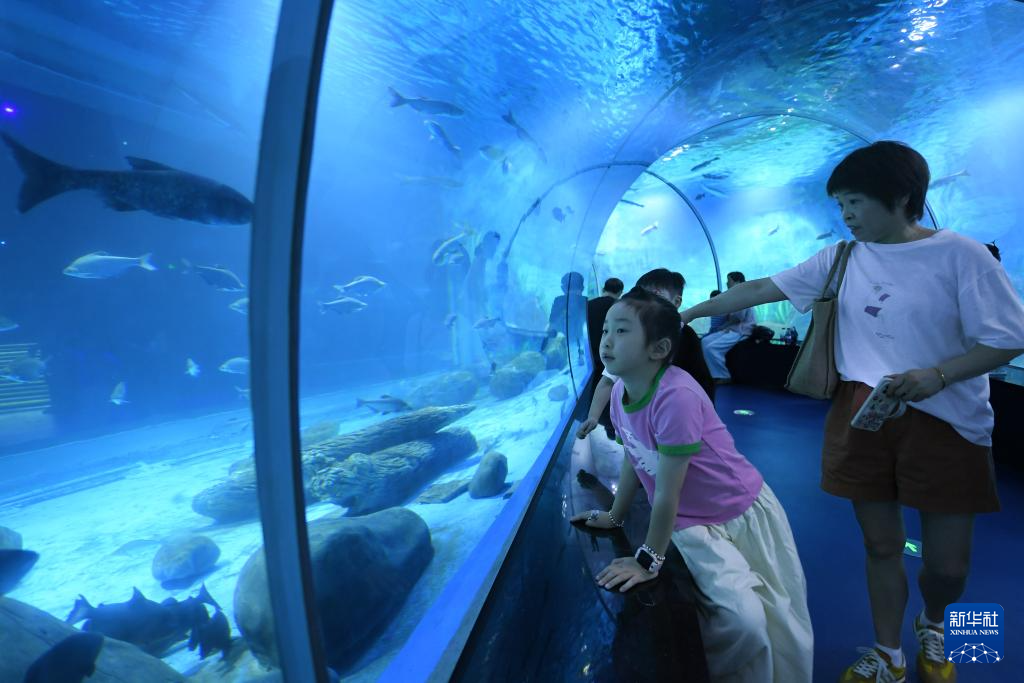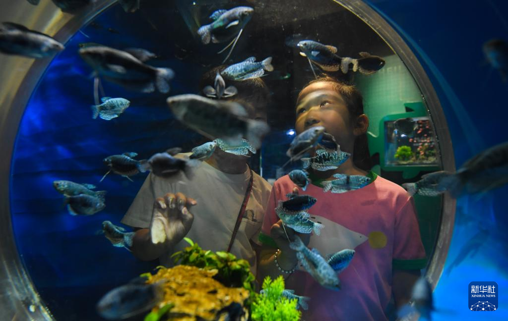 8月27日,家长带着孩子在浙东淡水鱼馆参观。