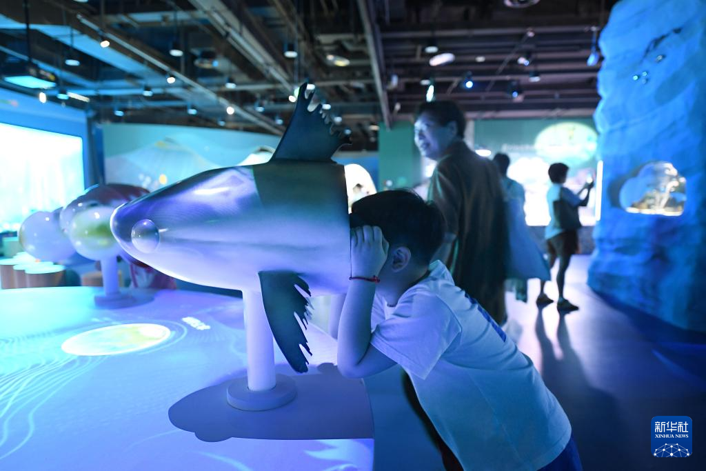 8月27日,在浙东淡水鱼馆,一名儿童通过VR眼镜观看鱼类的水下生活场景。