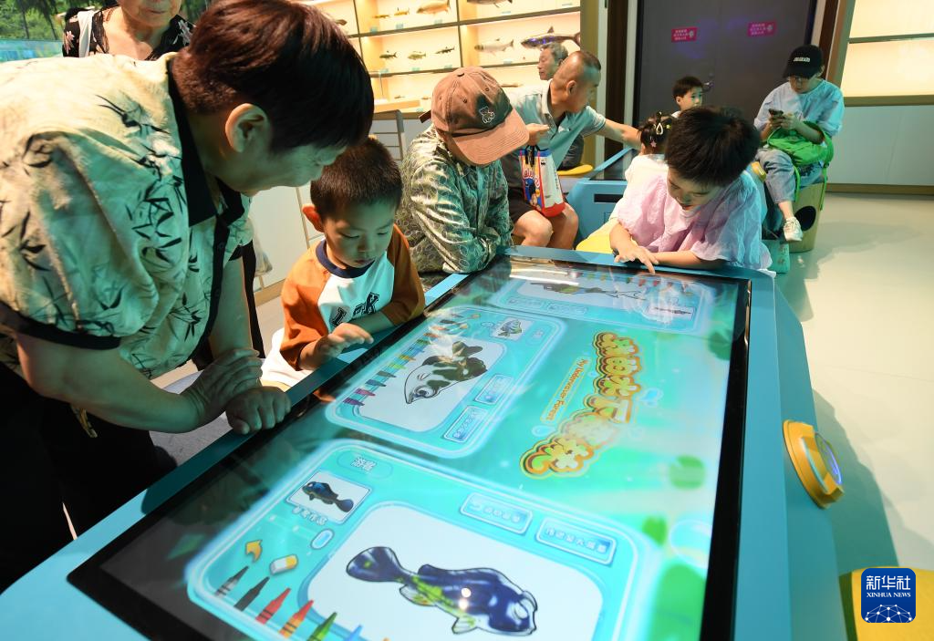 8月27日,在浙东淡水鱼馆,小朋友参与互动绘画游戏,用触摸屏给淡水鱼涂色。