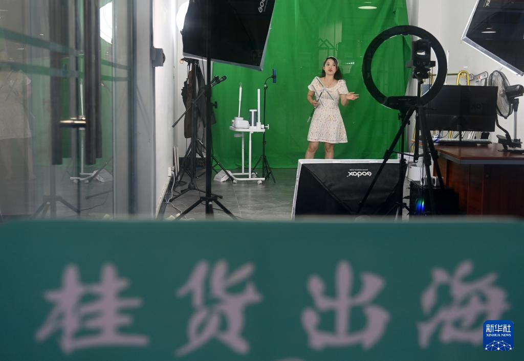 8月26日,在广西凭祥市跨境电商直播基地,工作人员在直播推销商品。
