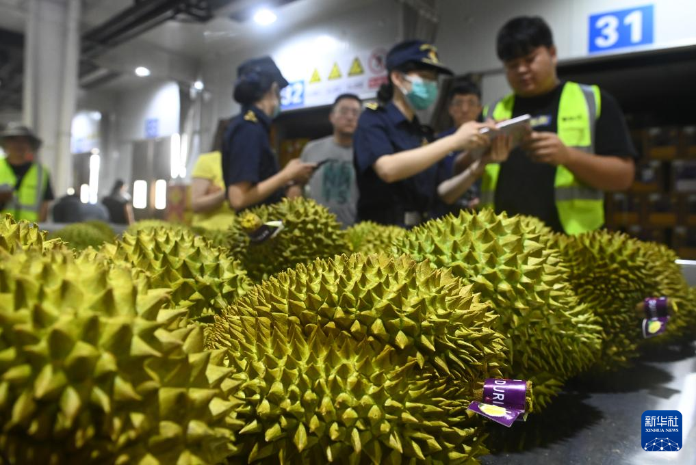 8月26日,在广西凭祥市友谊关口岸海关查验平台,工作人员在查验一批进口榴莲。