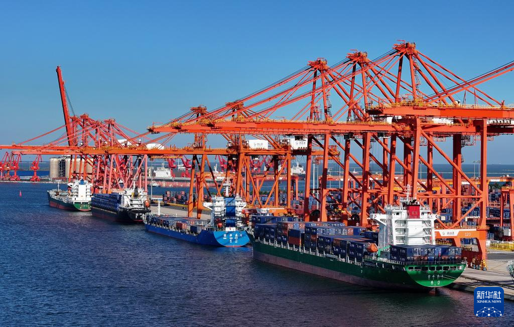 8月27日,轮船靠泊在唐山港京唐港区集装箱码头作业(无人机照片)。