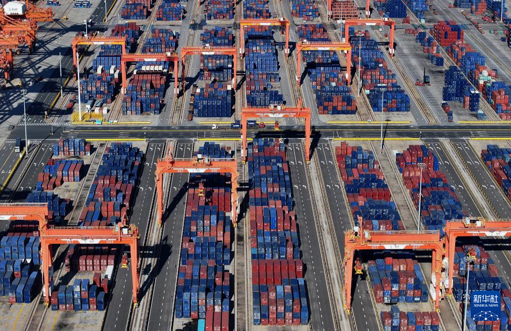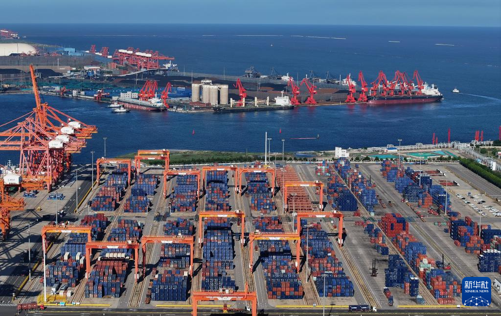 8月27日拍摄的唐山港京唐港区集装箱堆场(无人机照片)。