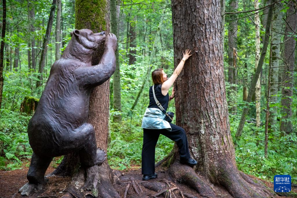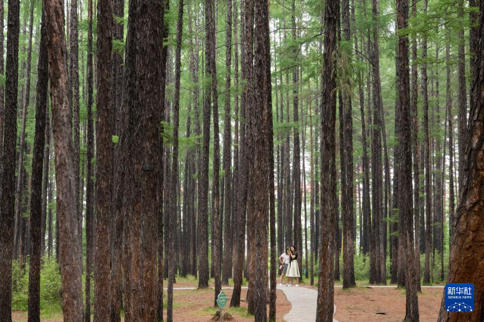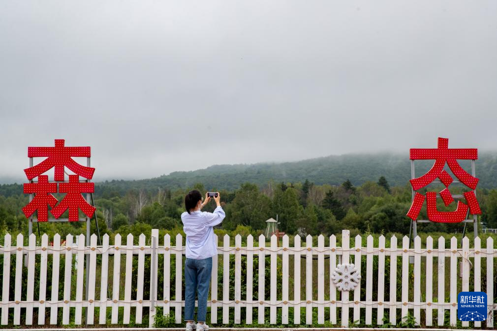 8月27日,游客在黑龙江伊春市上甘岭溪水国家森林公园内拍照。