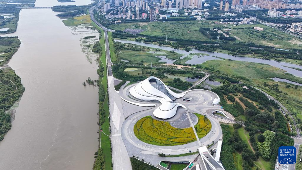 这是哈尔滨大剧院临江景色(8月20日摄,无人机照片)。