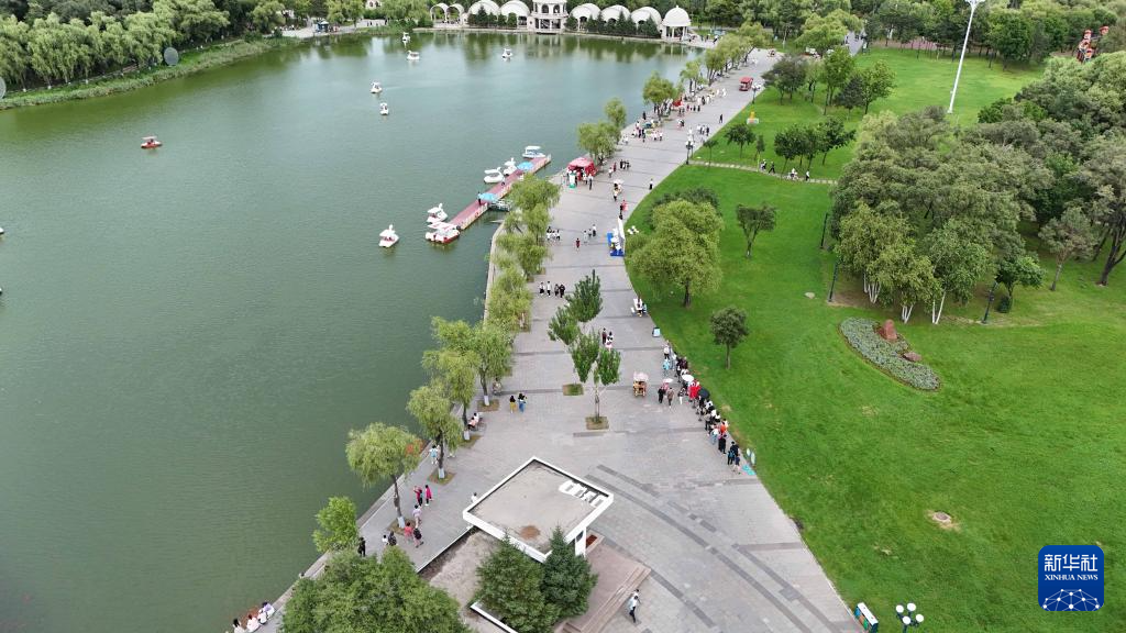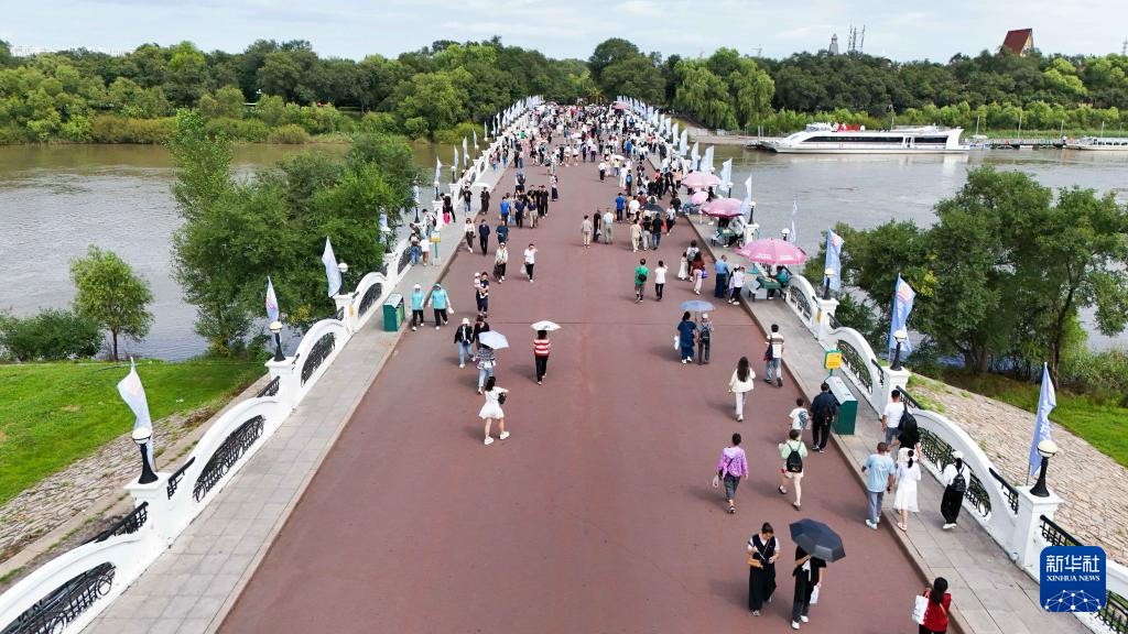 人们在龙江森工集团绥棱林业局生态文化旅游景区一处公园游览(7月25日摄,无人机照片)。