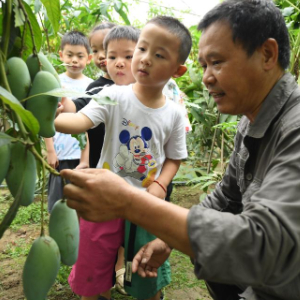 8月28日,在诸暨市浬浦镇,返乡创业的种植户姚雪锋在热带水果园内给参加研学的小学生介绍水果知识。