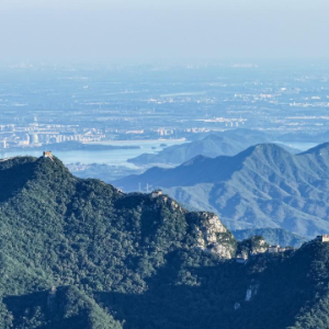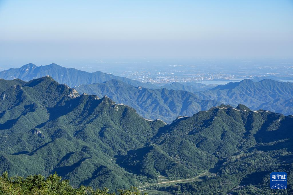 8月27日拍摄的箭扣长城,远处北京城区的CBD建筑群依稀可见(无人机照片)。