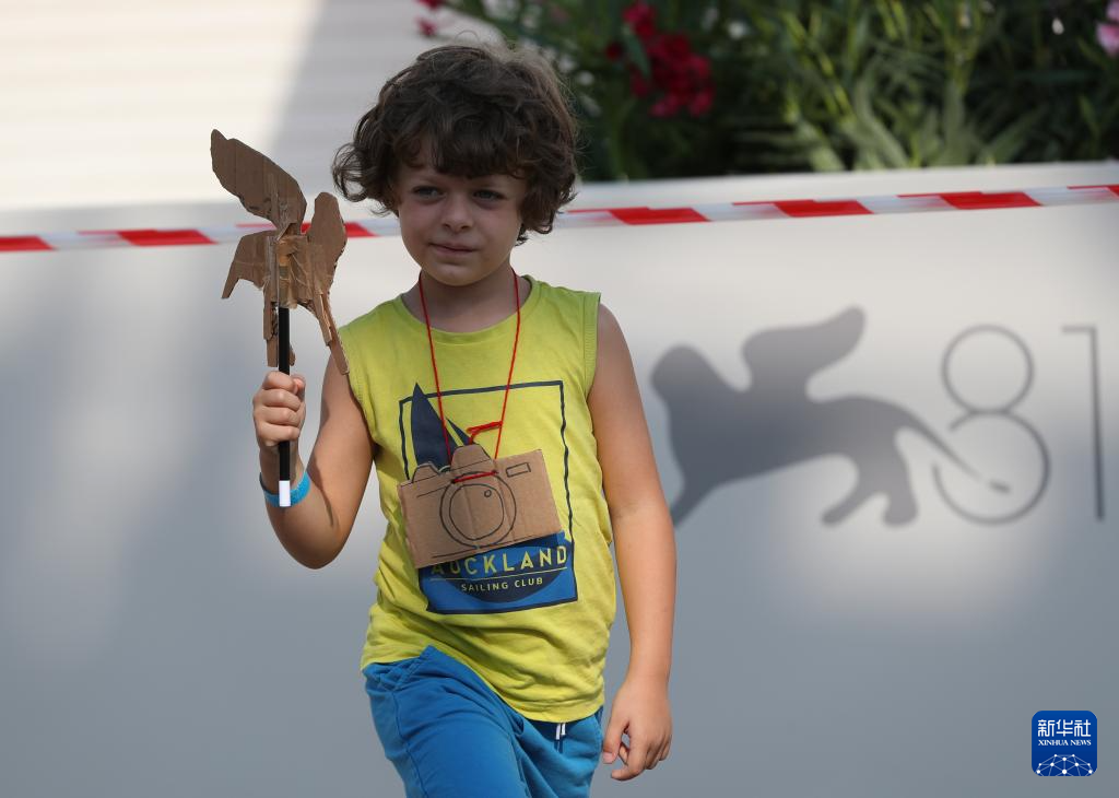 8月28日,在意大利威尼斯利多岛,一名小朋友在威尼斯电影节举办地电影宫前留影。