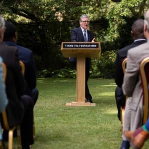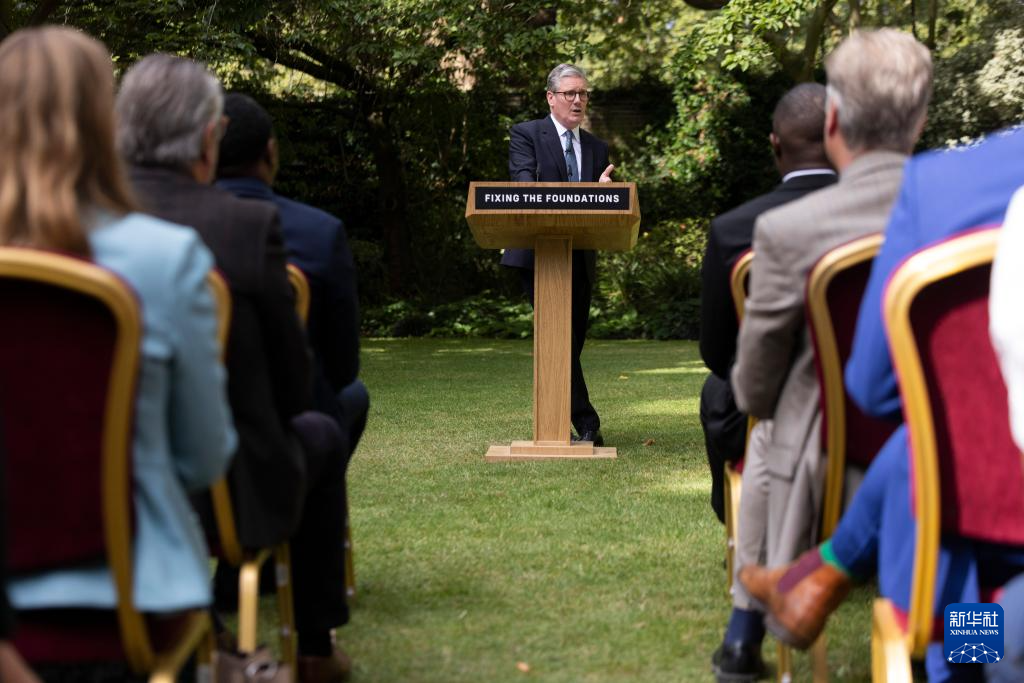 8月27日,英国首相斯塔默在伦敦唐宁街花园发表讲话。