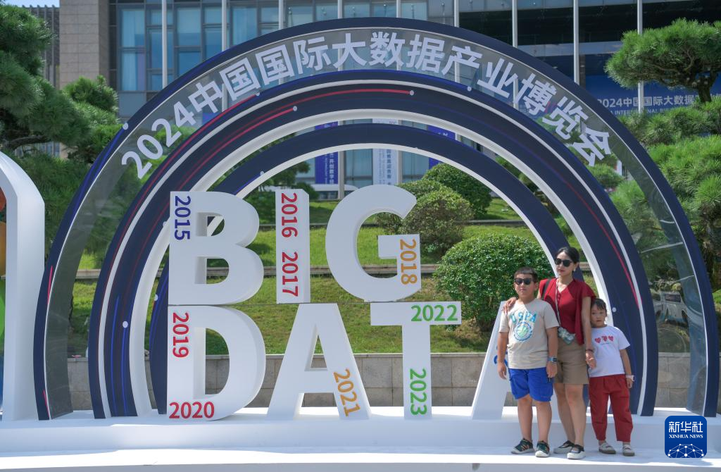 8月28日,市民在2024中国国际大数据产业博览会开幕式会场外留影。