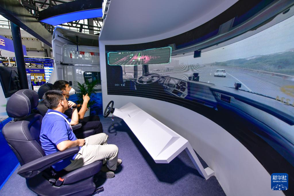 8月28日,工作人员在数博会上播放无人驾驶重型卡车上路行驶视频。