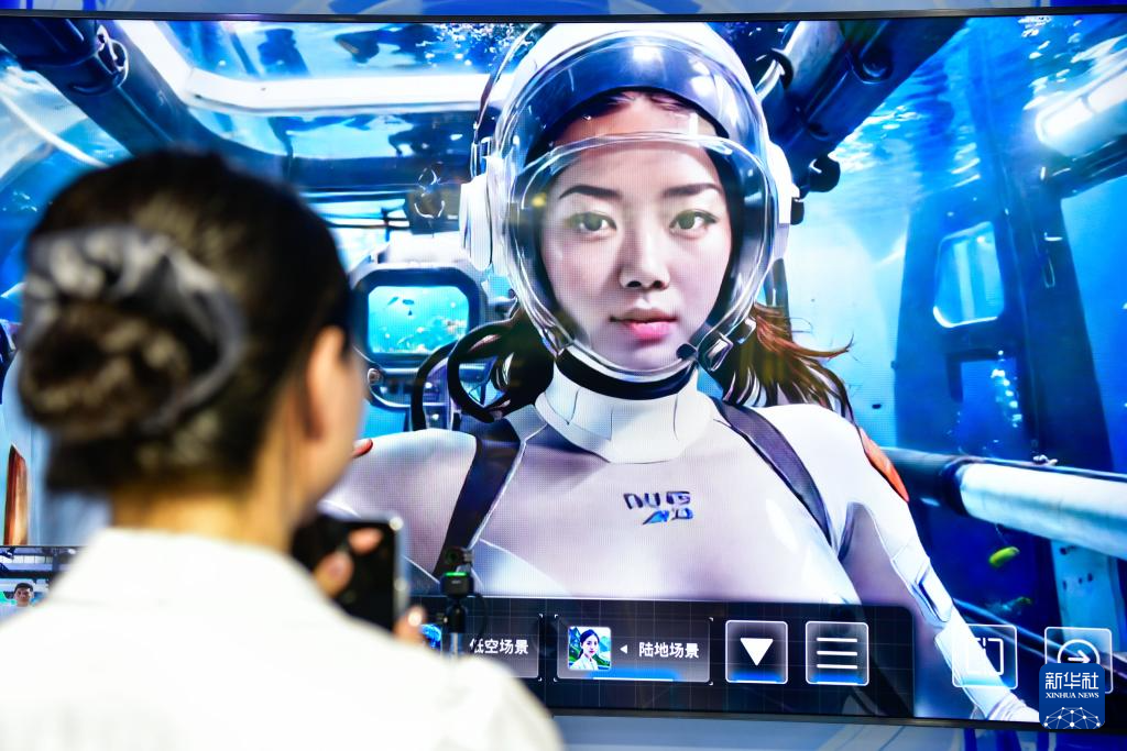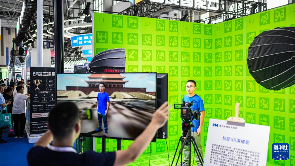 8月28日,参观者在数博会展馆内体验智能XR演播室。