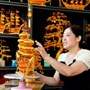 8月28日,在山东省滨州市惠民县辛店镇“如康家园”,工作人员康希芳直播销售残疾人加工的铝丝工艺品。