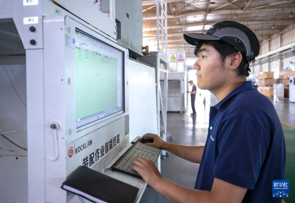8月28日,在位于银川经济技术开发区的共享智能装备有限公司3D打印设备产业化制造基地,工作人员操作装配作业智能终端。