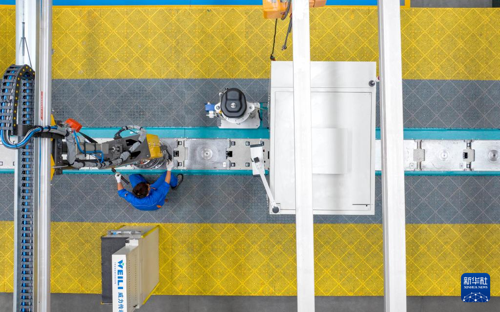 8月28日,在位于银川经济技术开发区的银川威力传动技术股份有限公司装配车间,工作人员对零件进行螺栓紧固作业(无人机照片)。