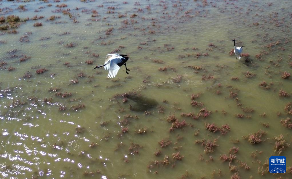 8月28日,丹顶鹤在黄河三角洲国家级自然保护区展翅翱翔(无人机照片)。