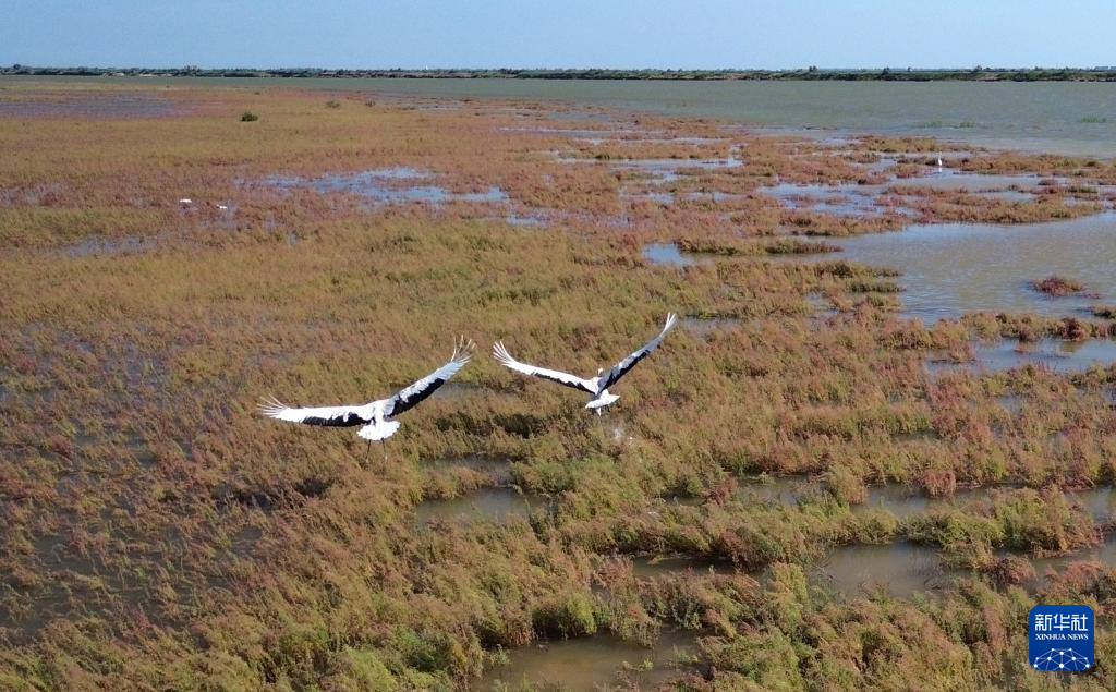 8月28日,鸟类在黄河三角洲国家级自然保护区湿地栖息。