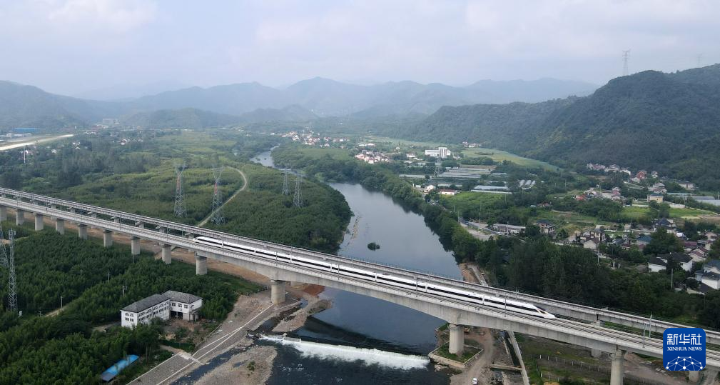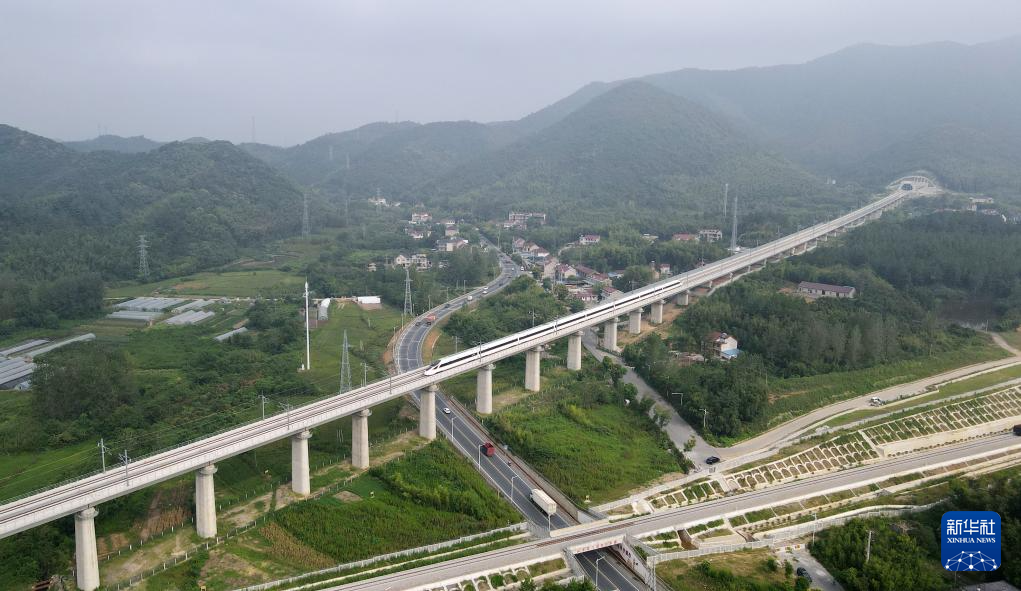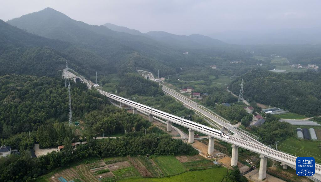 8月29日,试运行列车行驶在宣绩高铁线路上(无人机照片)。