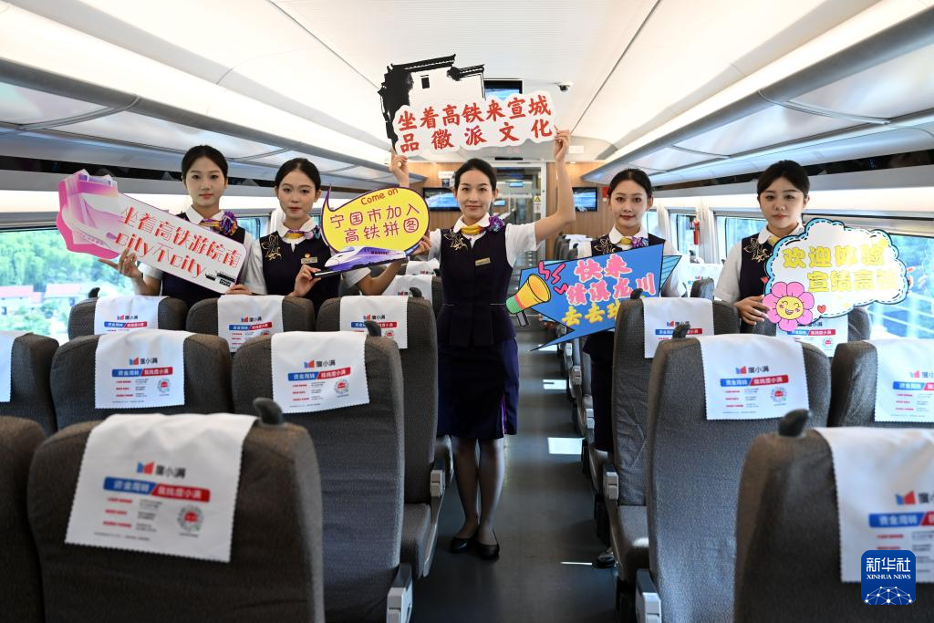 8月29日,列车乘务员在宣绩高铁试运行列车上欢迎乘客。