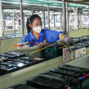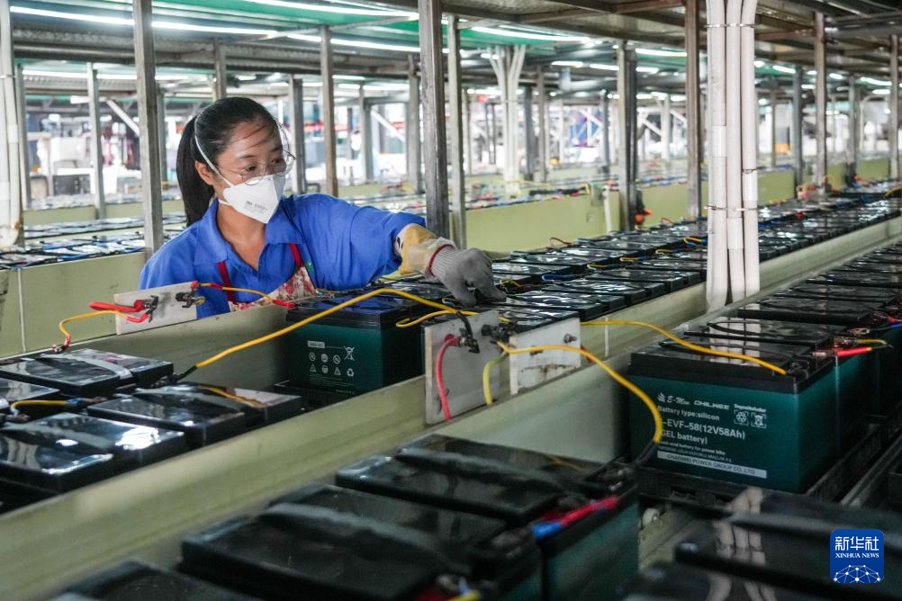 8月27日,宁阳县山东超威电源有限公司职工在生产蓄电池。