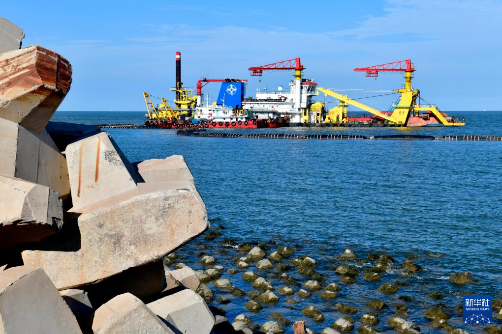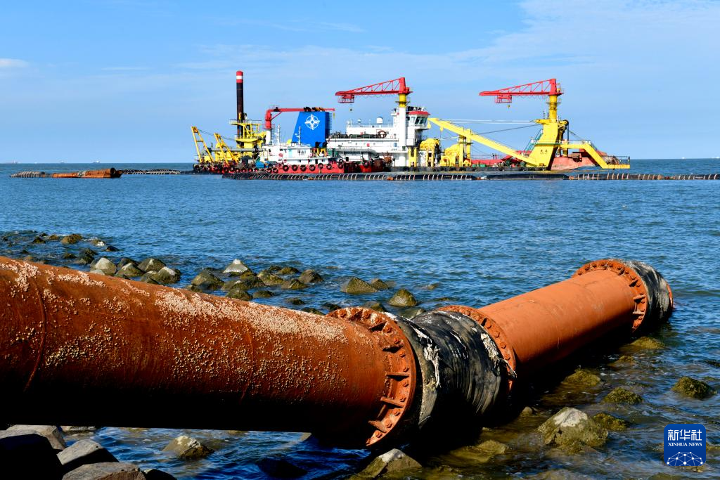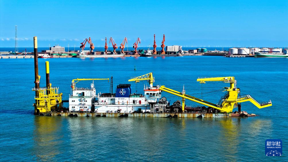 8月29日,在山东港口滨州港海港港区,疏浚船在进行航道维护性疏浚作业。
