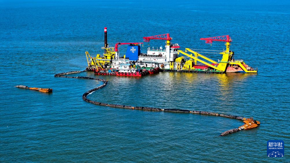 8月29日,在山东港口滨州港海港港区,疏浚船在进行航道维护性疏浚作业(无人机照片)。