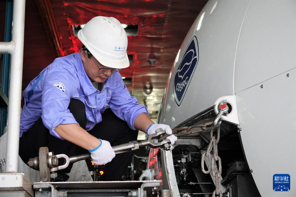 8月30日,“蛟龙号”运维保障工程师刘坤对返回甲板的“蛟龙号”进行系固。