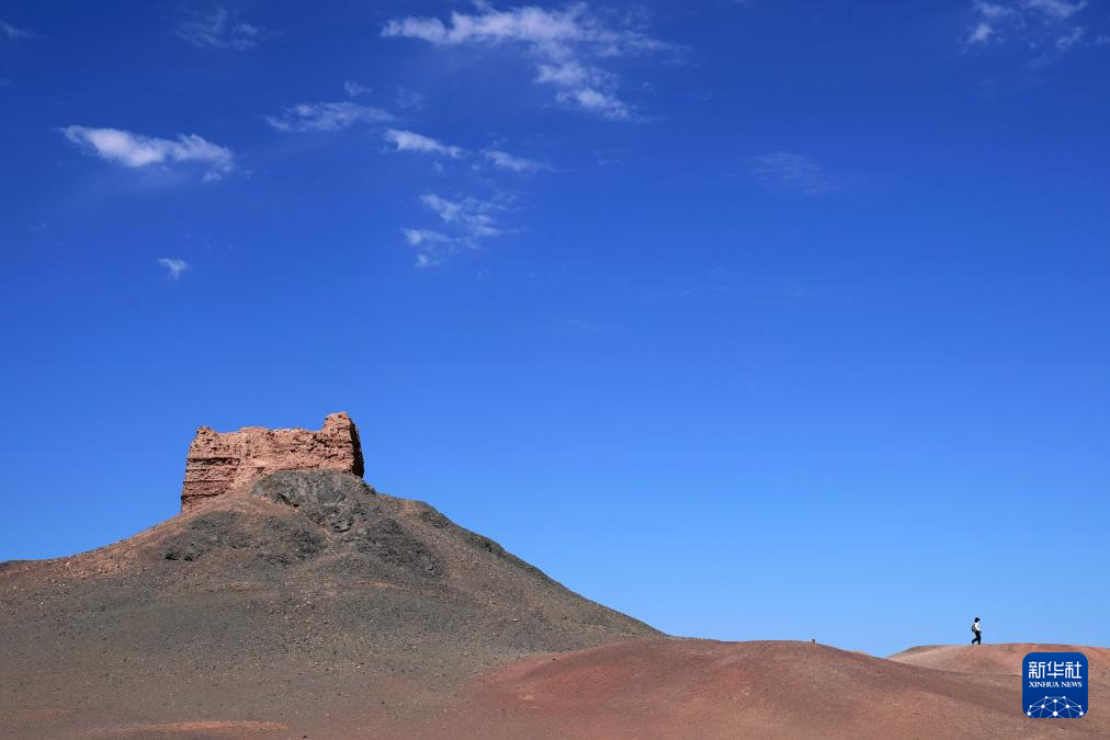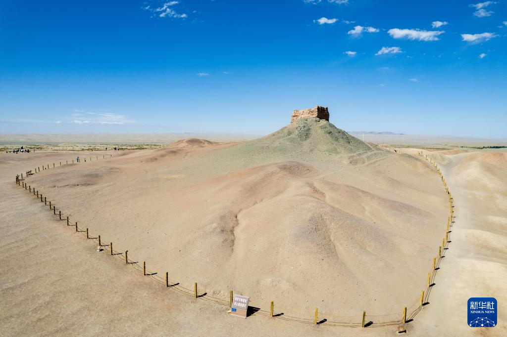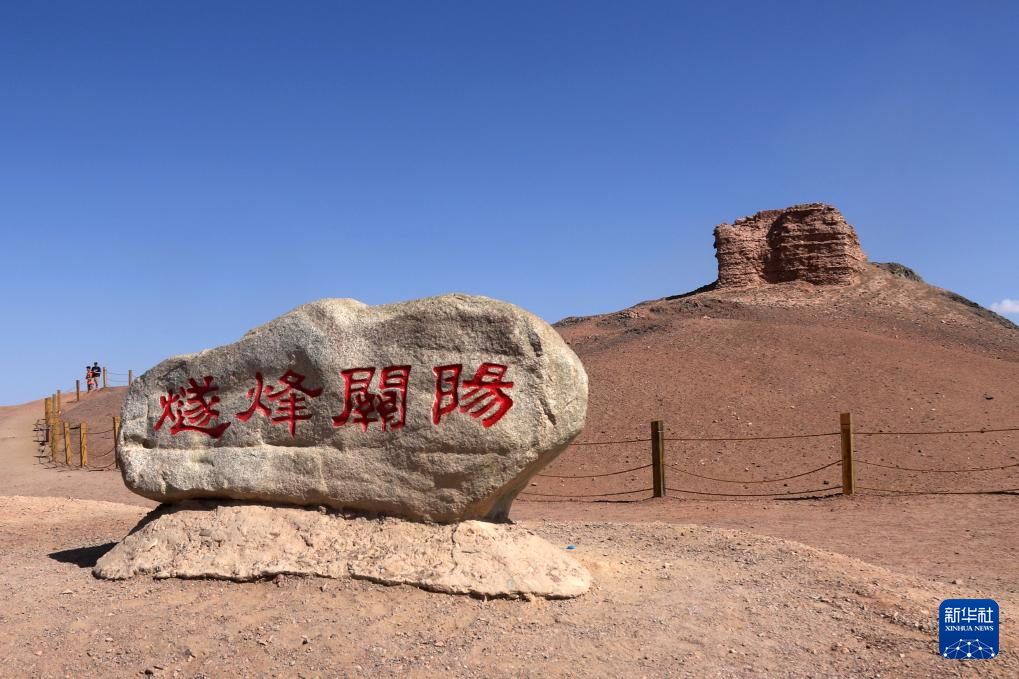 7月16日,游客在甘肃省敦煌市阳关景区内的阳关烽燧旁参观游览。