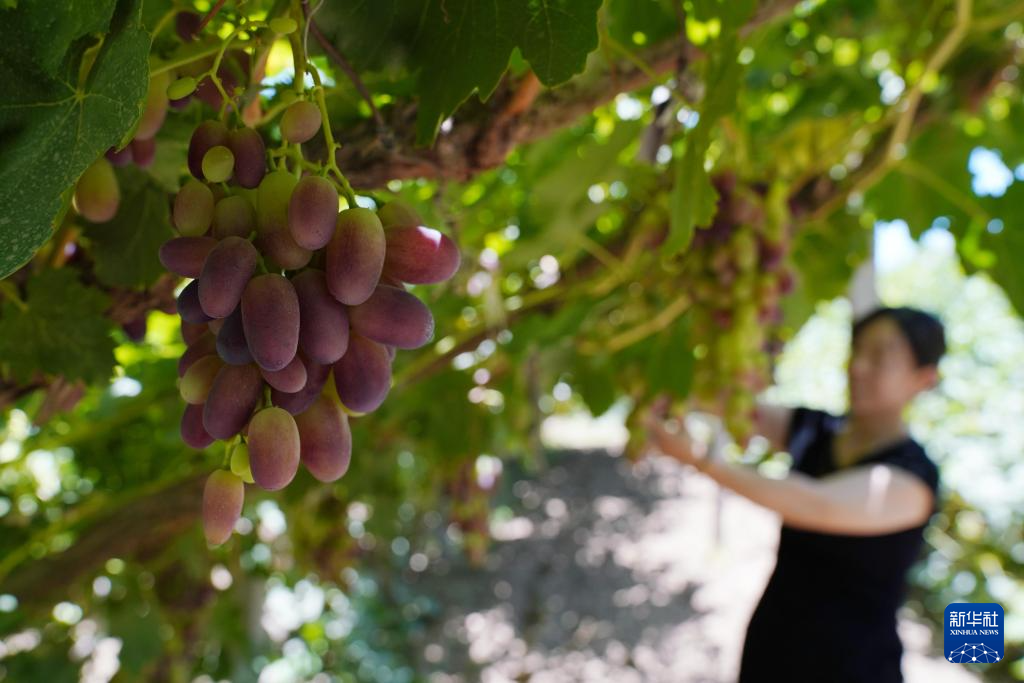 7月17日,游客在甘肃省敦煌市阳关镇采摘葡萄。