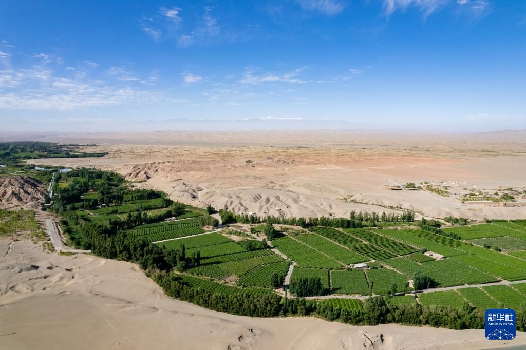 7月17日在甘肃省敦煌市拍摄的阳关景区和附近绿洲(无人机照片)。