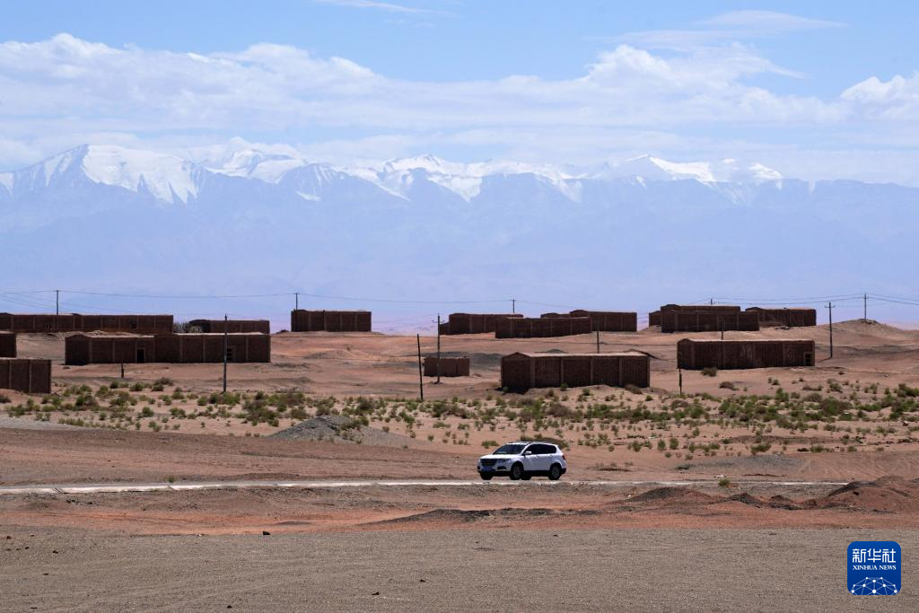 7月17日,在甘肃省敦煌市阳关景区附近,一辆汽车从葡萄晾房旁驶过。