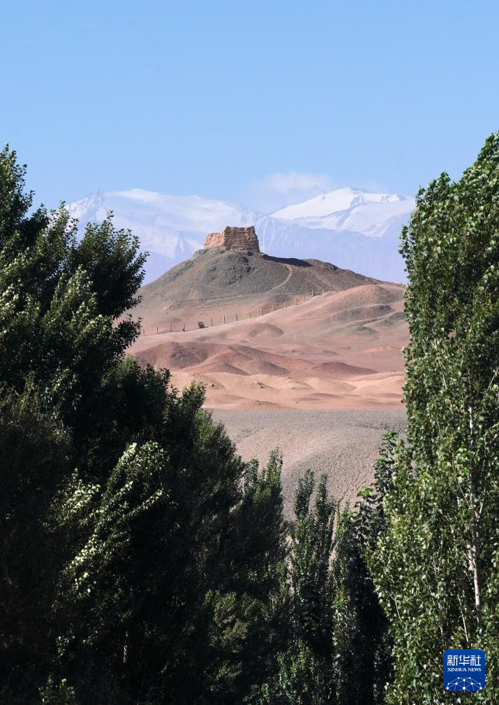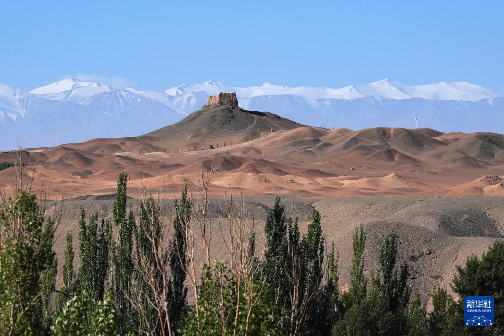 7月16日在甘肃省敦煌市拍摄的阳关烽燧和远处的雪山。