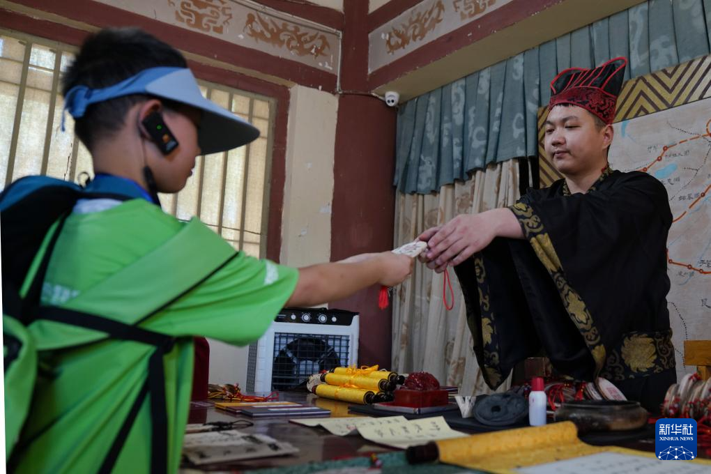 7月16日,在甘肃省敦煌市阳关景区,参加研学的学生体验通关仪式,领取“关照”。