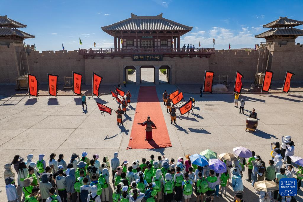 7月17日,在甘肃省敦煌市阳关景区,参加研学的学生观看表演(无人机照片)。