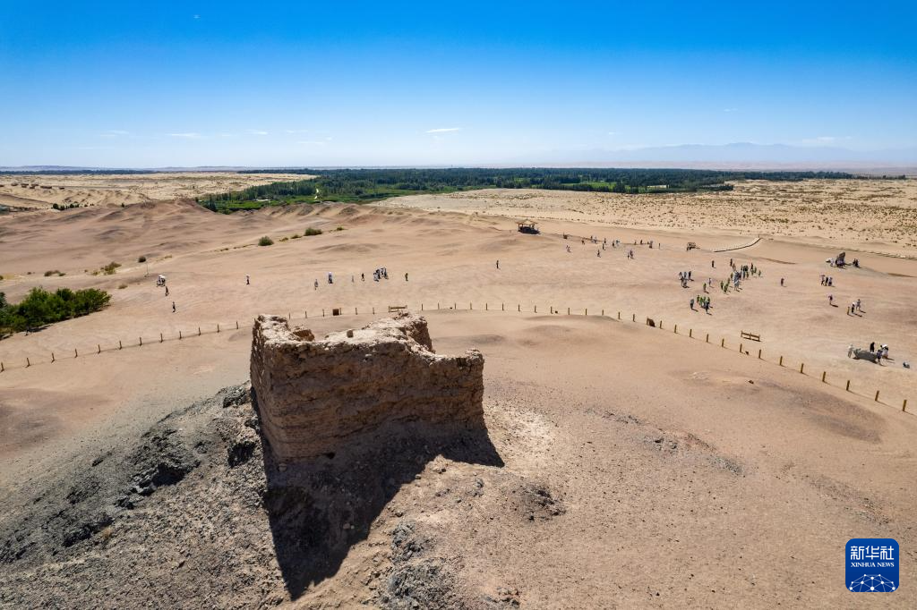 7月17日,游客在甘肃省敦煌市阳关景区参观游览(无人机照片)。