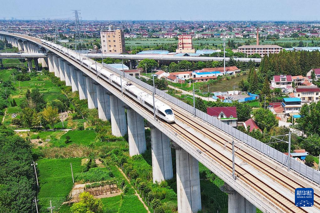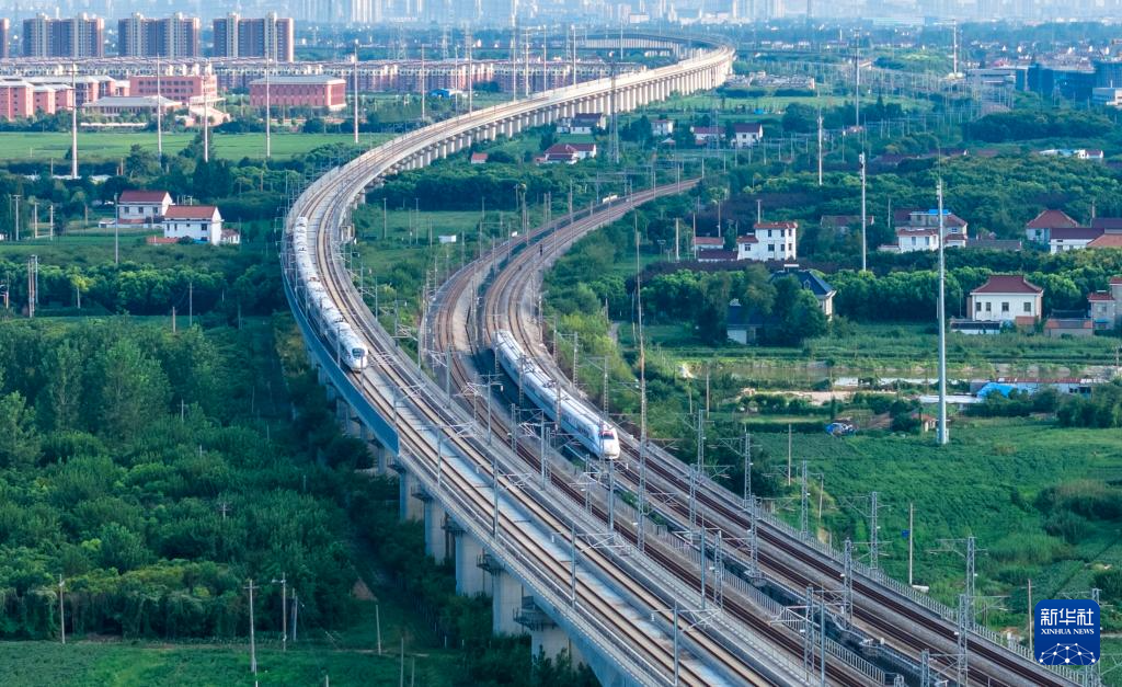 8月31日,动车组列车行驶在江苏省如皋市如城街道区域内(无人机照片)。