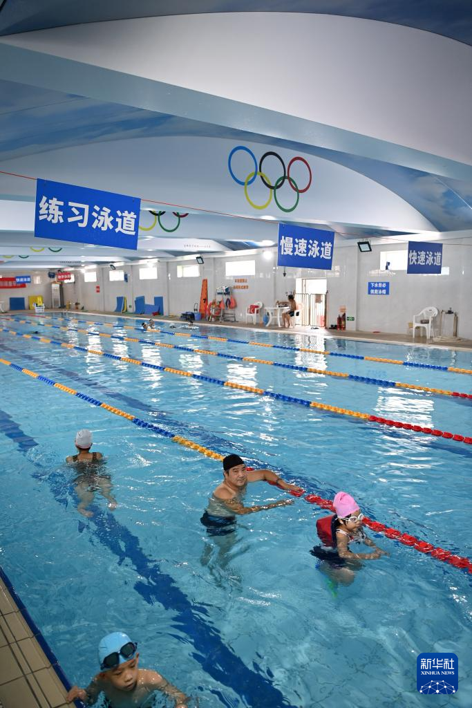 在天津市红桥区盖来普工业园,居民在游泳馆内游泳(8月30日摄)。