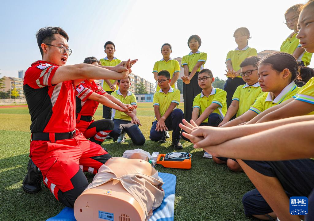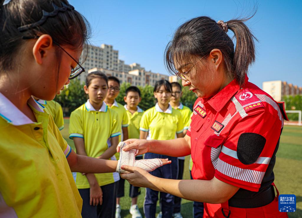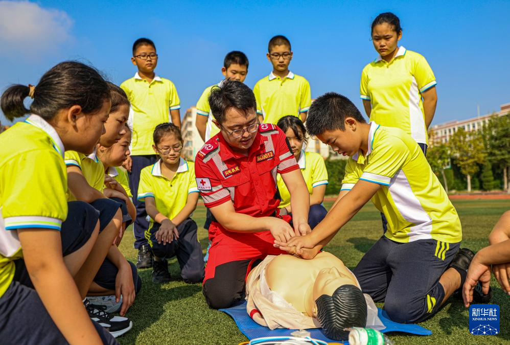 当日,在山东省荣成市第二实验中学,荣成市红十字会志愿者为学生们开展“开学第一课”应急救护技能培训活动,通过技能讲解和操作,让学生掌握基本急救方法,提高安全意识。