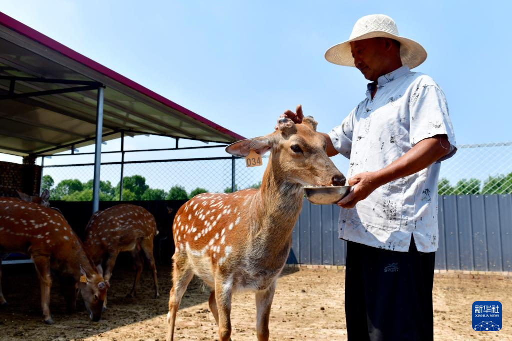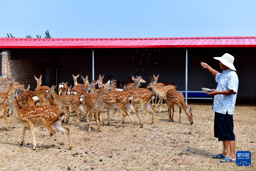 8月31日,在滨州市惠民县姜楼镇一家养鹿场,工作人员在喂梅花鹿。