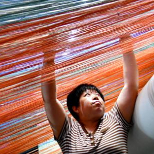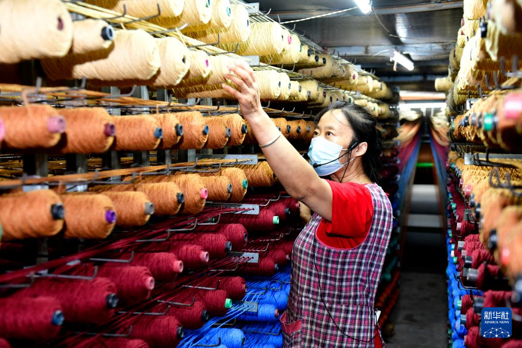 8月31日,在滨州市惠民县辛店镇一家地毯加工厂,工作人员在整理纺线。