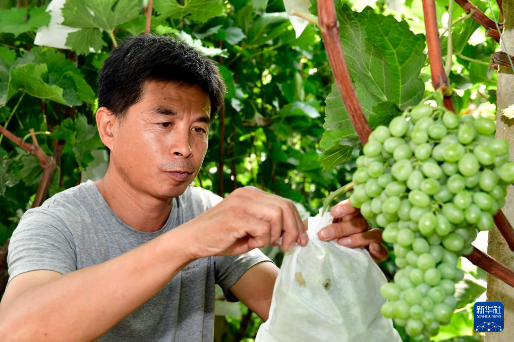 8月31日,在滨州市惠民县姜楼镇一家葡萄种植基地,工作人员为葡萄套袋。