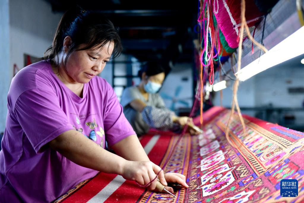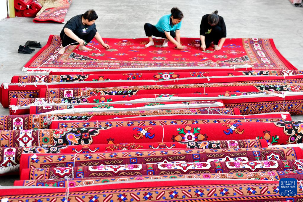 8月31日,在滨州市惠民县辛店镇一家地毯加工厂,工作人员在加工地毯。