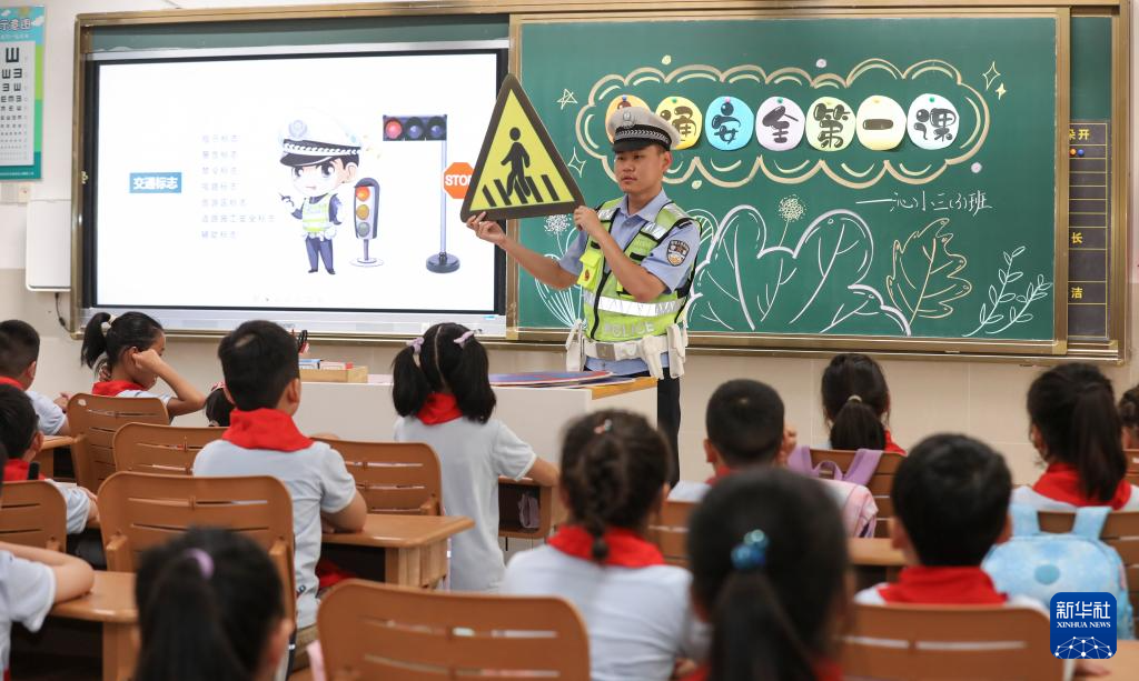 9月1日,交通警察给江苏省淮安生态文旅区沁春路小学学生讲解交通安全出行知识。