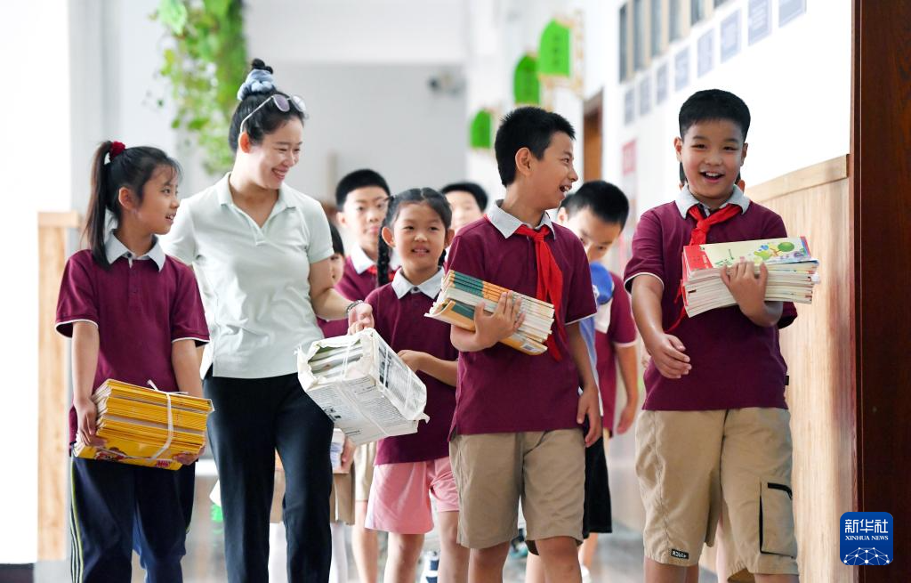 9月1日,在河北省石家庄市仁华小学,学生领取新学期课本。