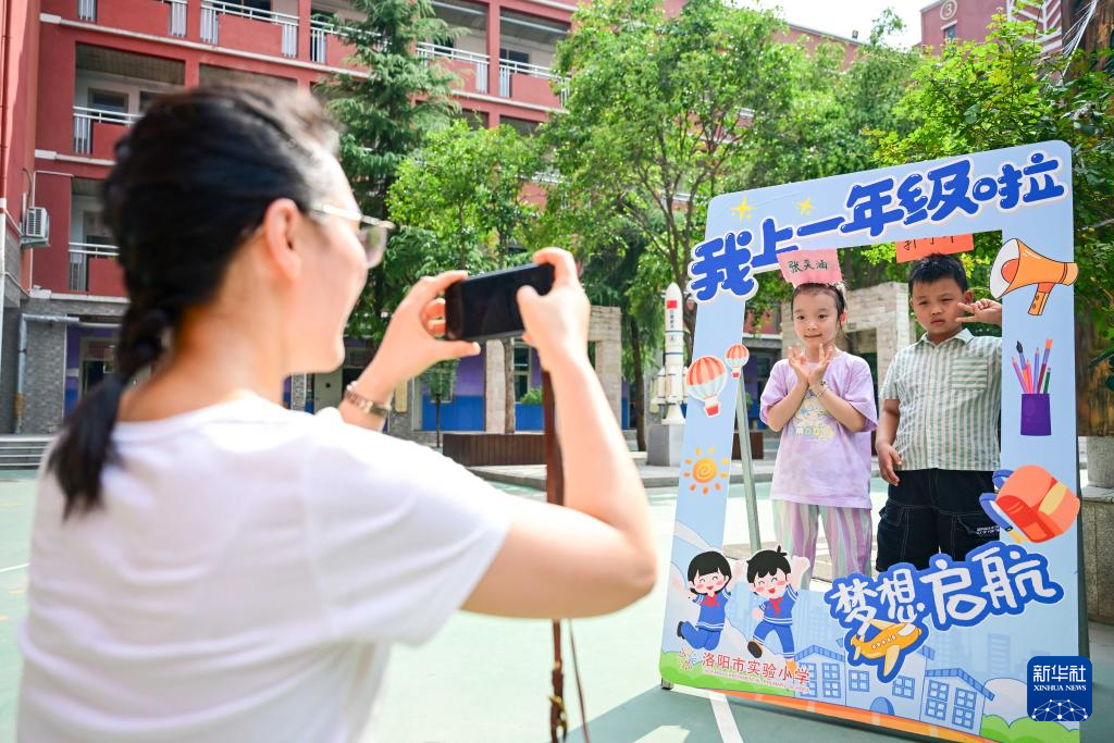 9月1日,在河南省洛阳市实验小学,老师给一年级新生拍照留念。