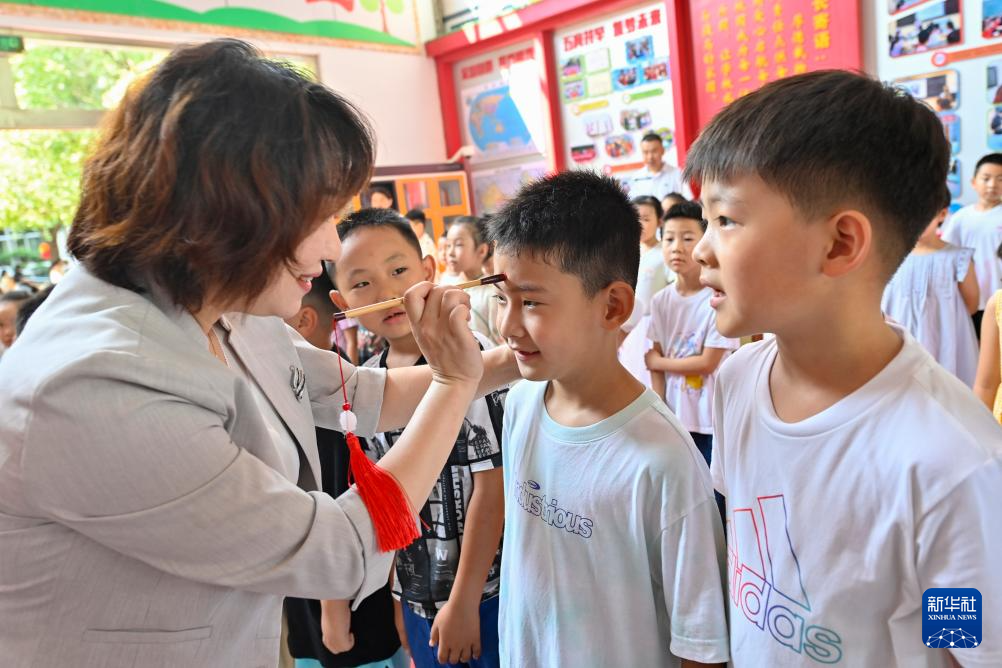 9月1日,山东省青州市西苑小学的老师在“开笔礼”上给一年级新生点朱砂。