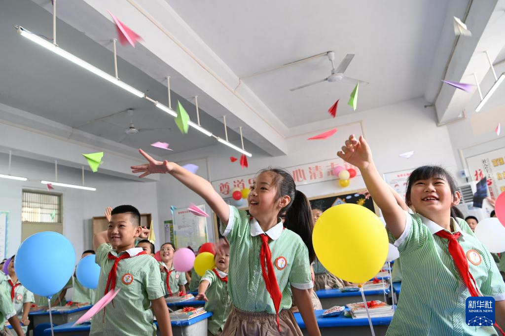 9月1日,在河南省焦作市道清小学,小学生们在放飞纸飞机,开启新学期的学习生活。