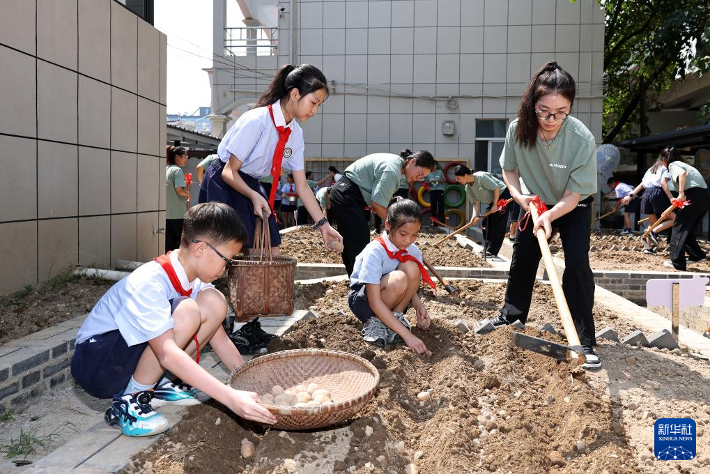 9月1日,在浙江省东阳市江北湖田小学劳动基地,老师和学生一起开耕土地,播撒种子。