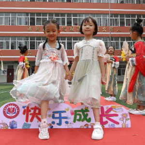 9月1日,河北省邯郸市邯山区火磨小学的一年级新生在进行“跨栏礼”。